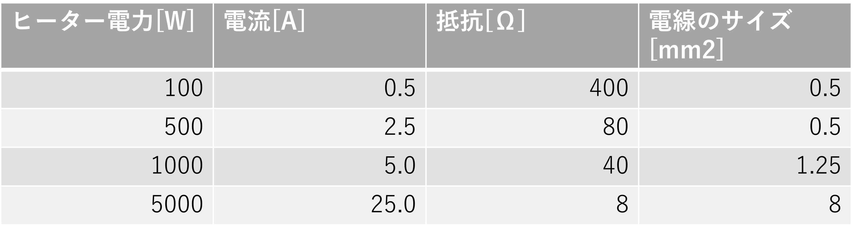 上記の表(電源電圧200Vの場合)では、電圧200Vをかければ1000W出力される抵抗(ヒーターそのもの)を選定し、その時には電流5Aが発生するという読み方になります。