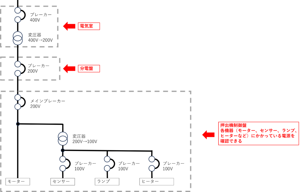 画像右端にある分電盤(配電盤という名前で管理していることもあります)から押出機の制御盤へ電源が供給されます。