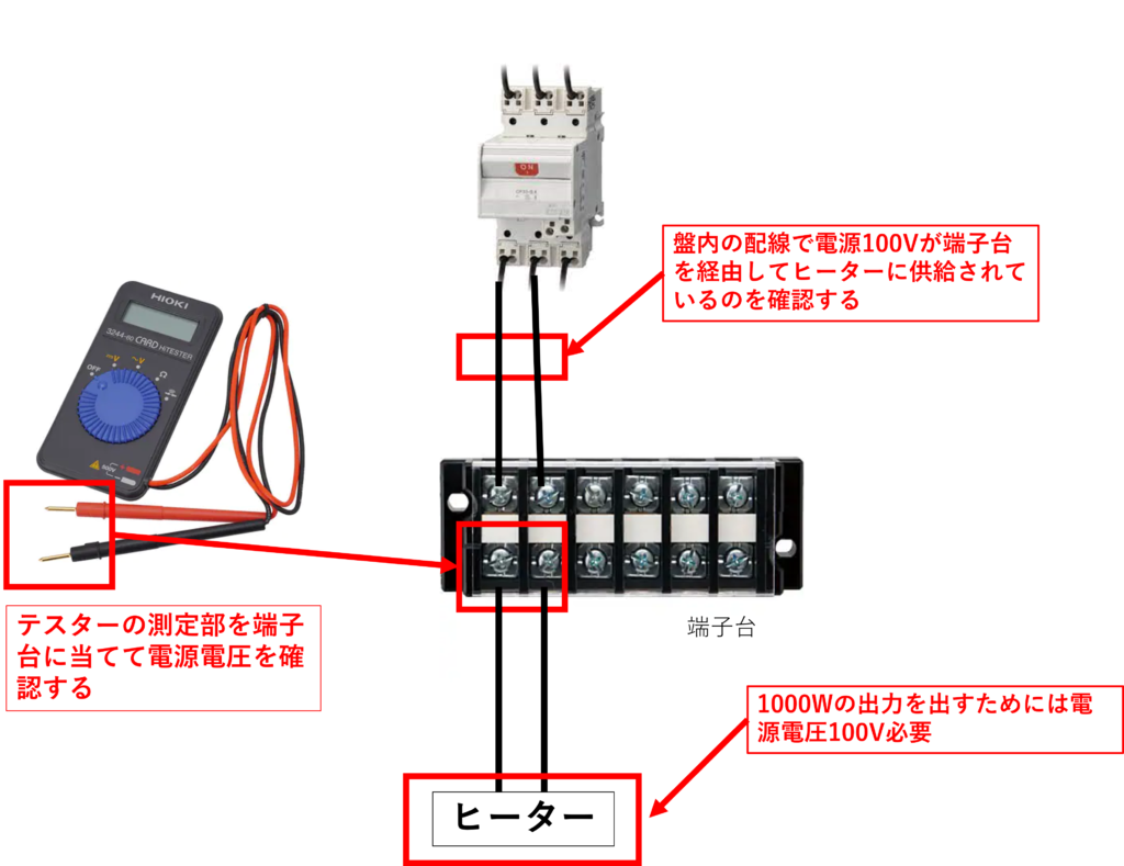 サーキットプロテクターから制御盤内の端子台を経由してヒーターへ100Vを供給しているはずなので、端子台でテスターを使って電源100Vがかかっているか確認できます。