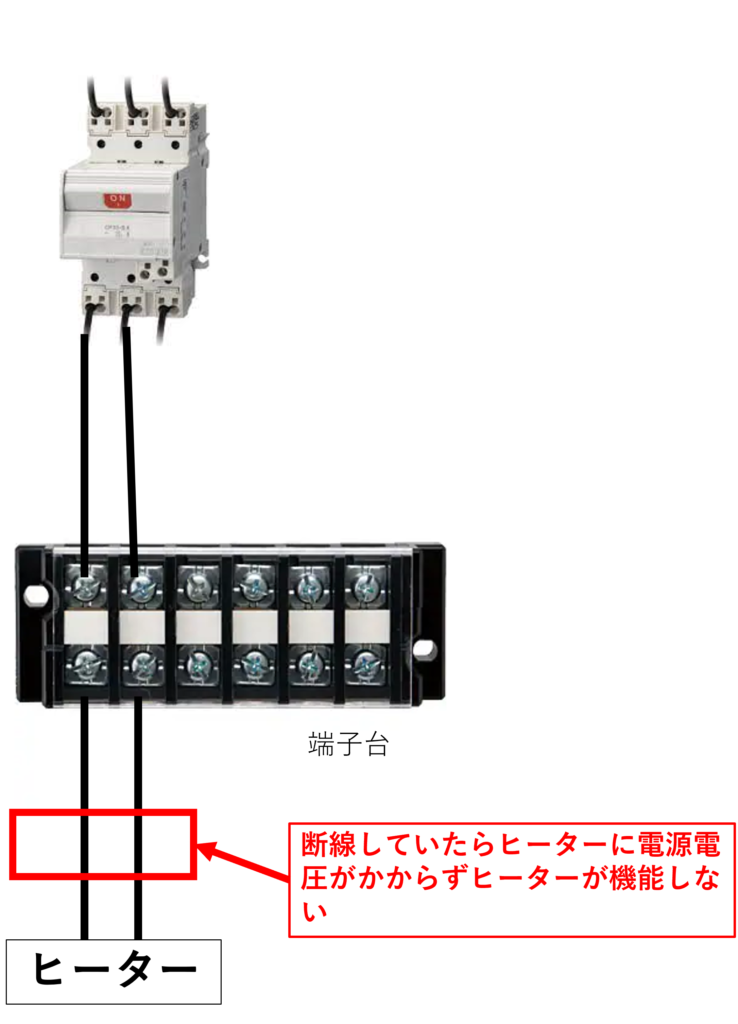 上記は先ほどと同じ例ですが、サーキットプロテクターで端子台を経由してヒーターに電圧をかけている構成です。