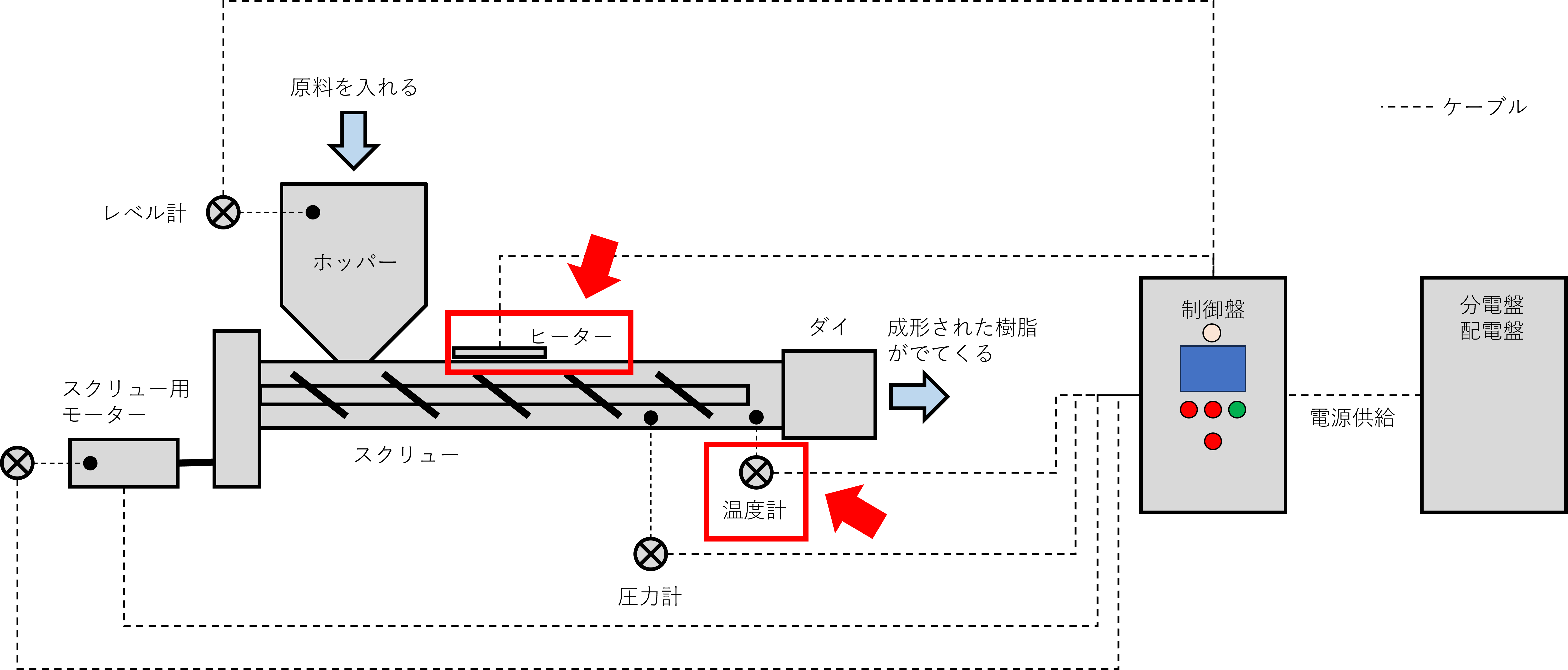 押出機にはヒーターだけではなく様々な機器やセンサーが設置されており、それぞれ電源が必要です。