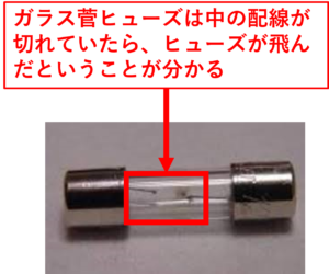 また、以下のようにガラス菅ヒューズが飛んだ時は目で確認できます。