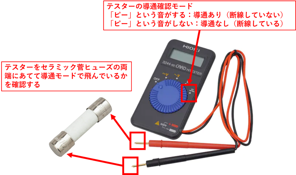 テスターを使ったセラミック菅ヒューズが飛んだかどうかの確認方法は以下の通りです。