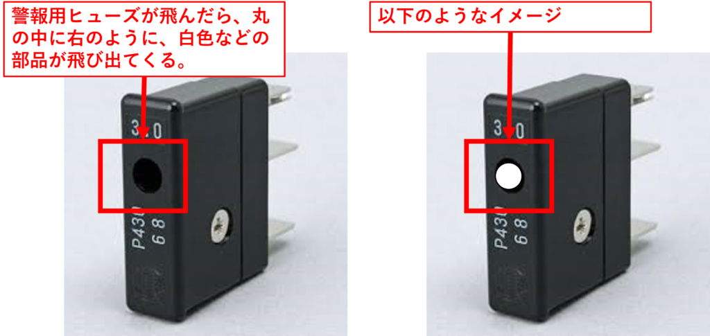 警報用ヒューズが飛んだ場合は、以下のイメージの通りヒューズの丸い穴から白色などの部品が飛び出てきます。