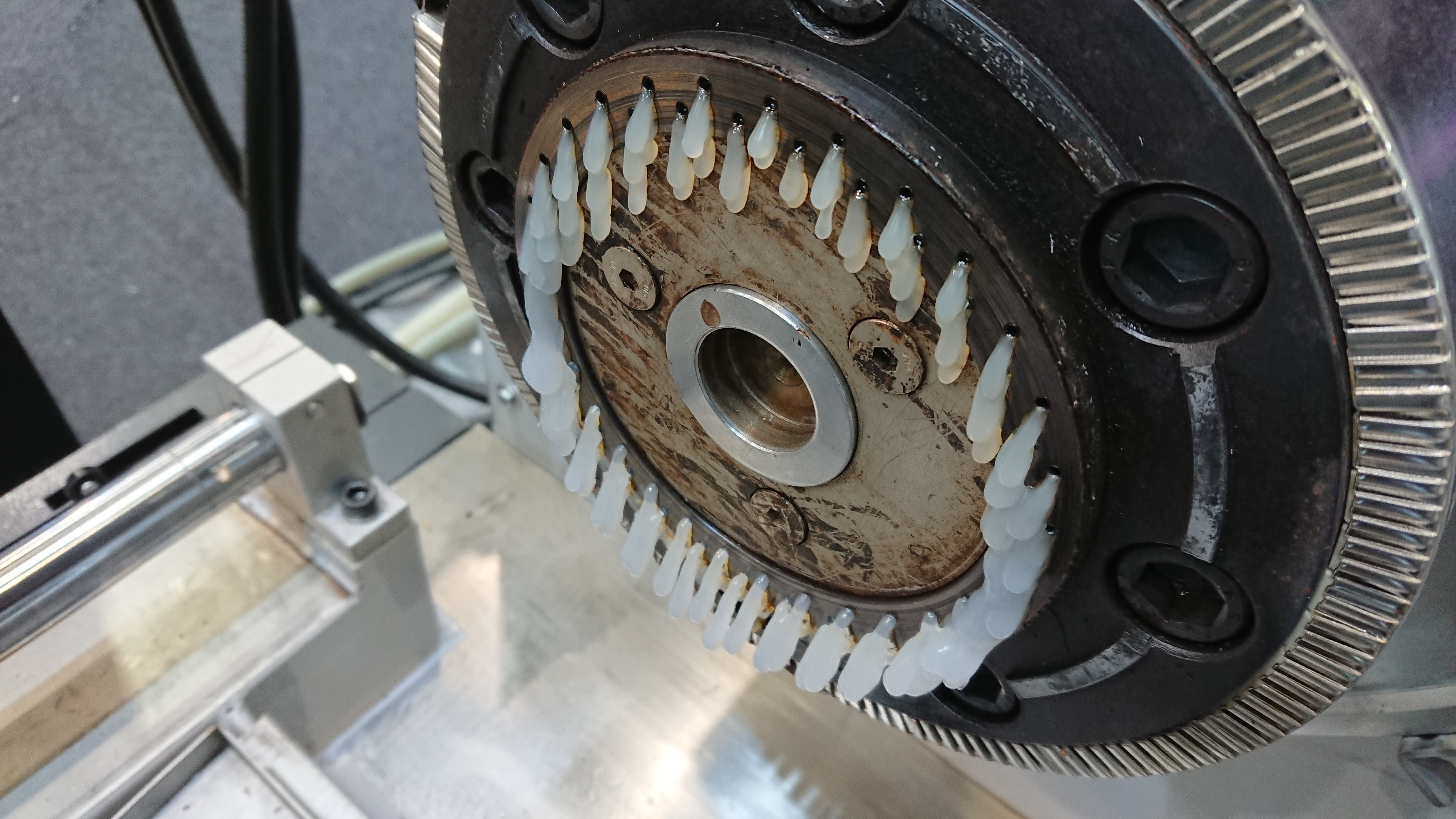 そのダイスから出てきた樹脂をダイスの表面上でグルグルと高速で回転する回転刃が出てきた樹脂を瞬間的にカットしていくという方式になります。