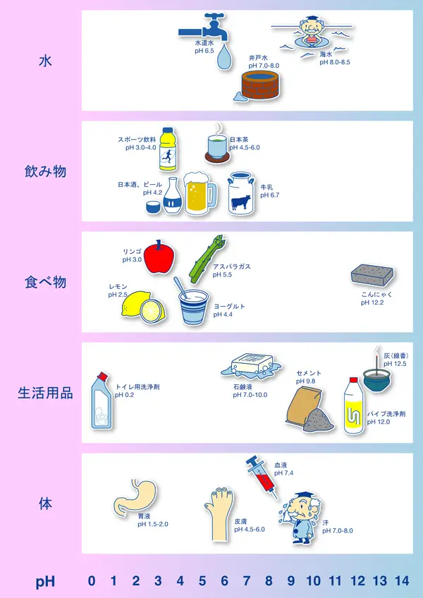pHとは、水溶液が酸性なのか、塩基性(アルカリ性)なのかを示す指標です。基本は0~14までの数値で示し、7が中性、7よりpHが小さくなるほど酸性寄り、7よりpHが大きいほど塩基性寄りです。